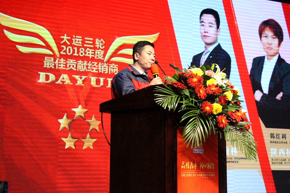 獲獎經(jīng)銷商代表,陜西創(chuàng)天商貿(mào)有限公司李彥宏先生,在經(jīng)銷商發(fā)言環(huán)節(jié)中提到,2018年成績斐然,相比2017年銷量提升53%。2019年,在市場疲軟的情況下,會盡最大的努力爭奪市場份額,因為大運(yùn)品牌馳名中外;因為大運(yùn)有自主發(fā)動機(jī)、全資獨(dú)立工廠;更因大運(yùn)有能量,團(tuán)隊有信心。